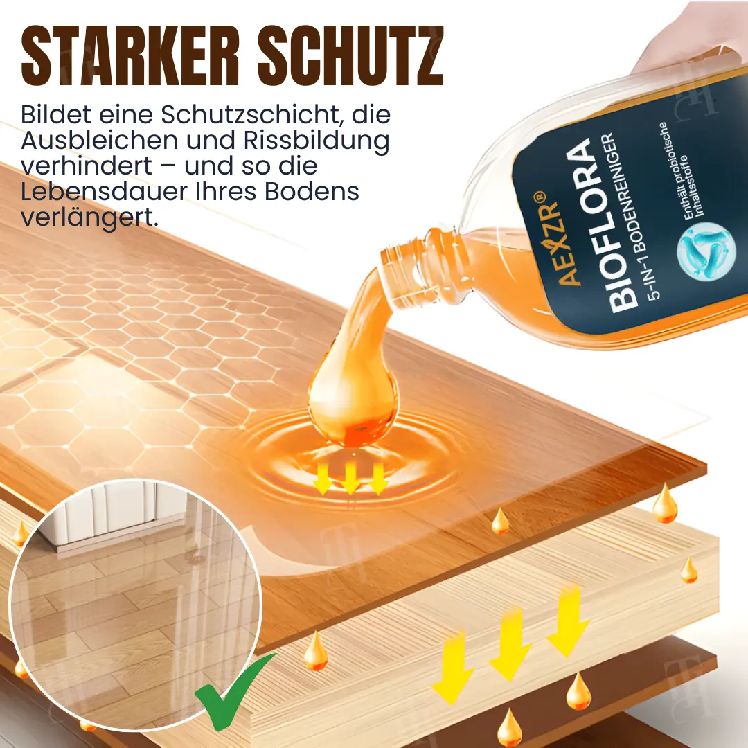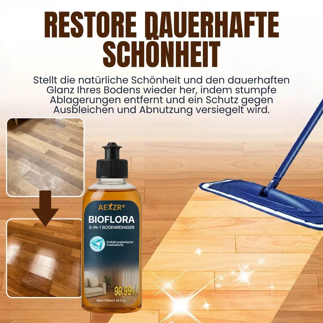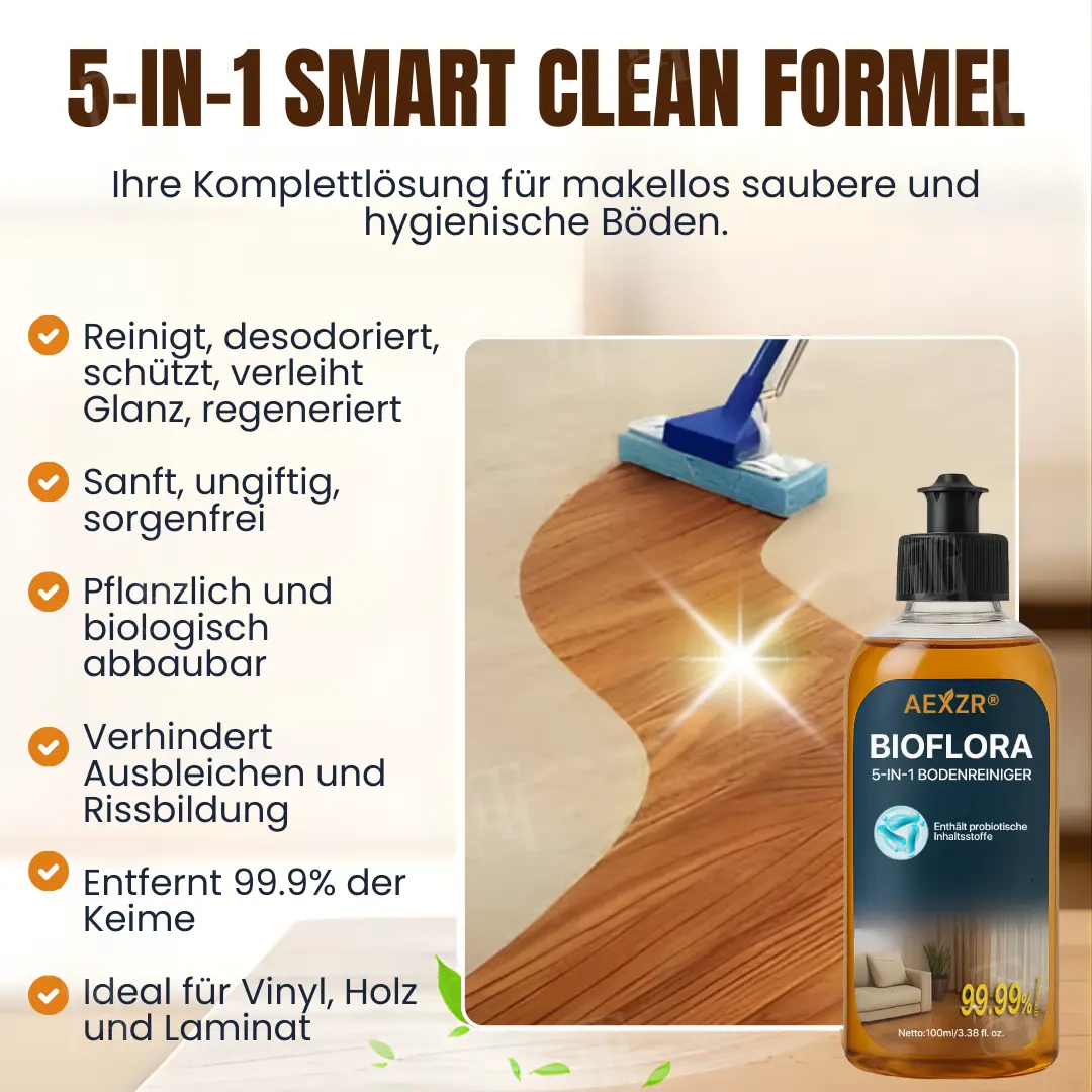 BioFlora 5-in-1 Bodenreiniger = Sofortiger Glanz + 10 Minuten trocken + 3-5 Tage kontinuierlicher Schutz